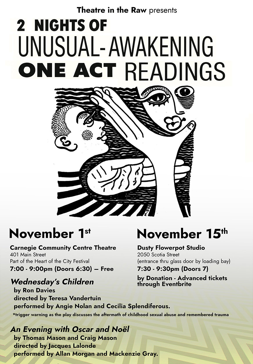 An Evening with Oscar and Noël by Thomas Mason and Craig Mason, with Allan Morgan and Mackenzie Gray, directed by Jacques Lalonde. What would happen if two of the greatest, most influential and hilarious playwrights met in the afterlife? Come to the reading and you’ll find out!