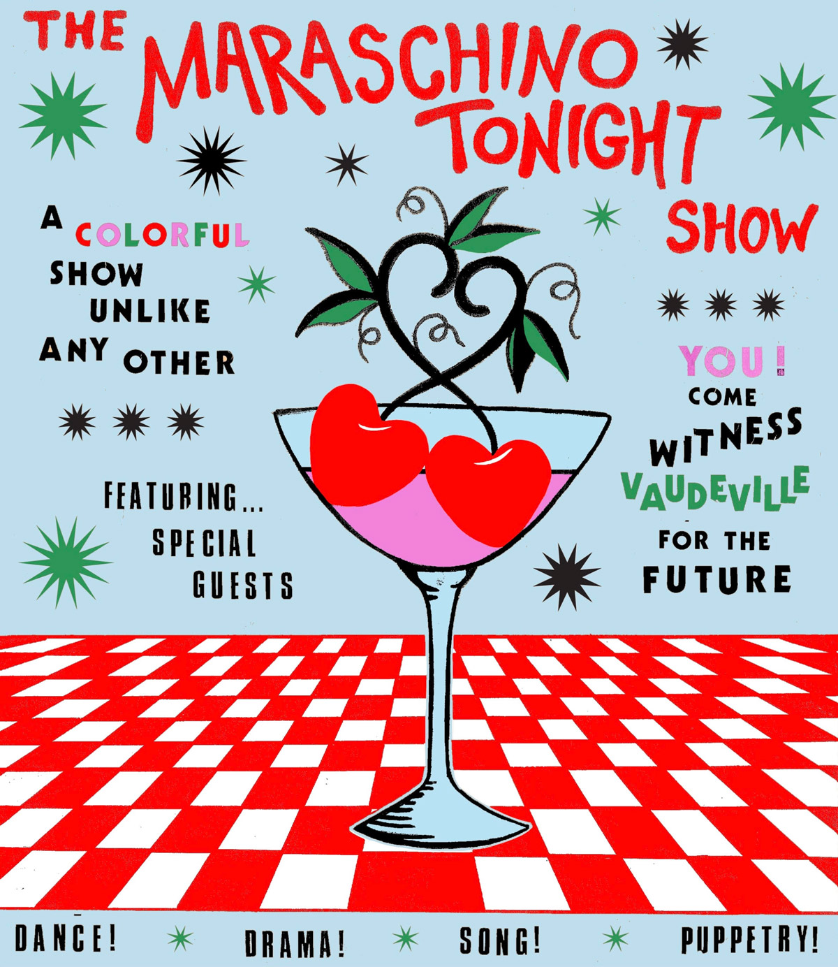 A fabulous evening of entertainment that has it all! In this timeless variety show, host and enigmatic entertainer Cherry Maraschino is accompanied by a ragtag crew of artists, puppets, and nefarious rascals. Part bygone house party, part community theatre, Maraschino Tonight is a playful interrogation of contemporary nostalgia.